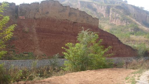 红土是黄土的基底,红土的出现预示着黄土地层下延的结束。眼前这段红土顶面向沟谷倾斜,说明在其上黄土未披覆以前这里就存在以红土为谷坡的沟谷。其上黄土顺势披覆,二者间的接触关系清晰可辨。