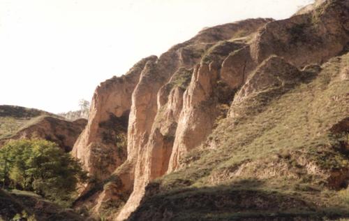 著名风景旅游区庐山素有“横看成岭侧成峰”的不朽佳句传世,黄土地质景观与其亦有异曲同工之妙。从这里望去,黄土谷坡呈现尖顶状,俨然是远在异国的金字塔再现,其景其势颇为壮观。