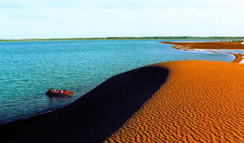 红碱淖,中国陕西省北部毛乌素沙漠内一淡水内流湖,面积67平方公里,属神木县尔林兔镇管辖。位于陕西省神木县尔林兔镇与内蒙古鄂尔多斯市新街镇刀劳窑村陕蒙交界处,总面积为90平方公里,淖上水光粼粼,烟波浩淼,水草丰盛,环境宜人,景色壮观,融草原风光与江南泽国景象于一体,是旅游度假的理想水上乐园。