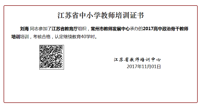 刘海 同志参加了 江苏省教育厅 组织, 常州市教师发展中心 承办的 2017高中政治骨干教师培训 培训,考核合格,认定继续教育40学时。