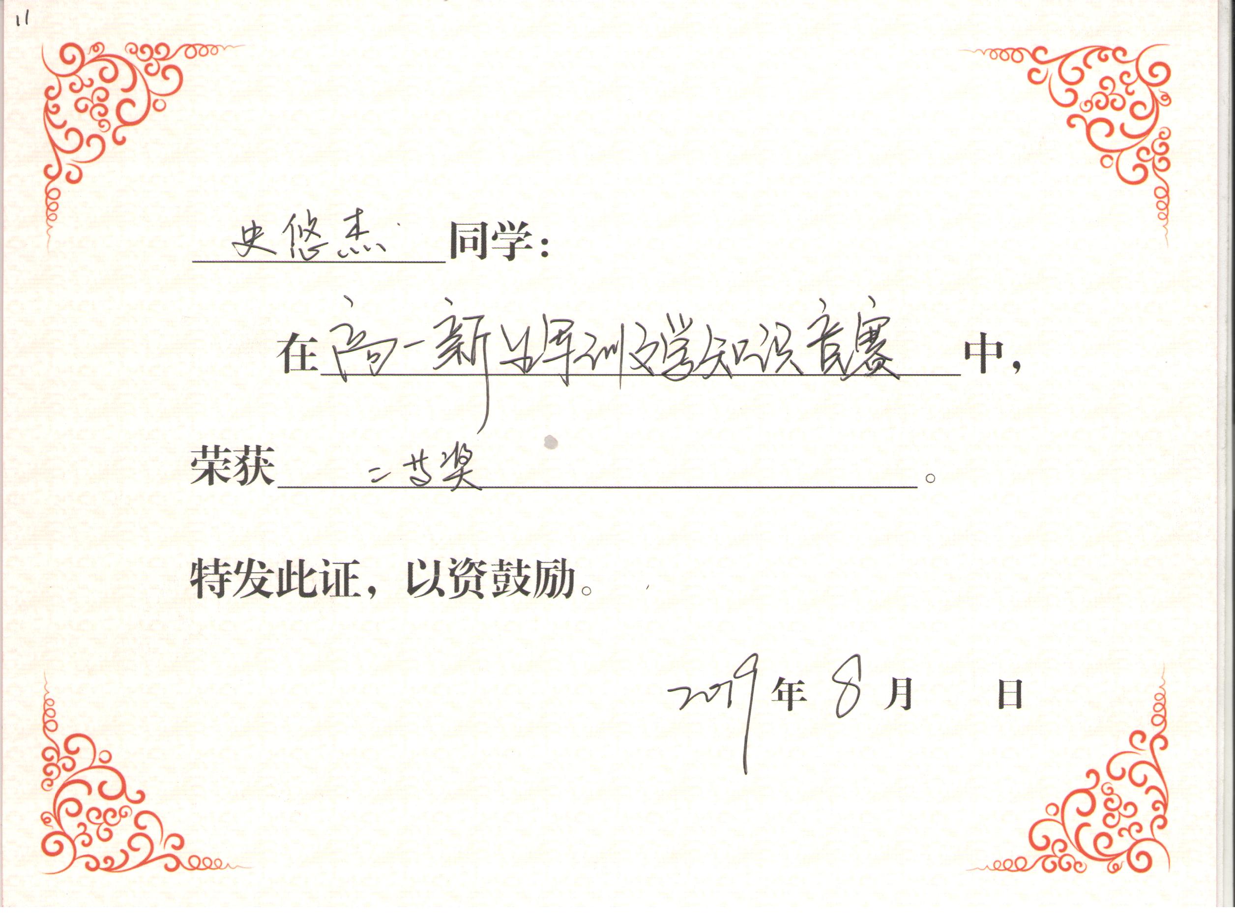 高一11班新生军训文学常识竞赛获奖证书 201908