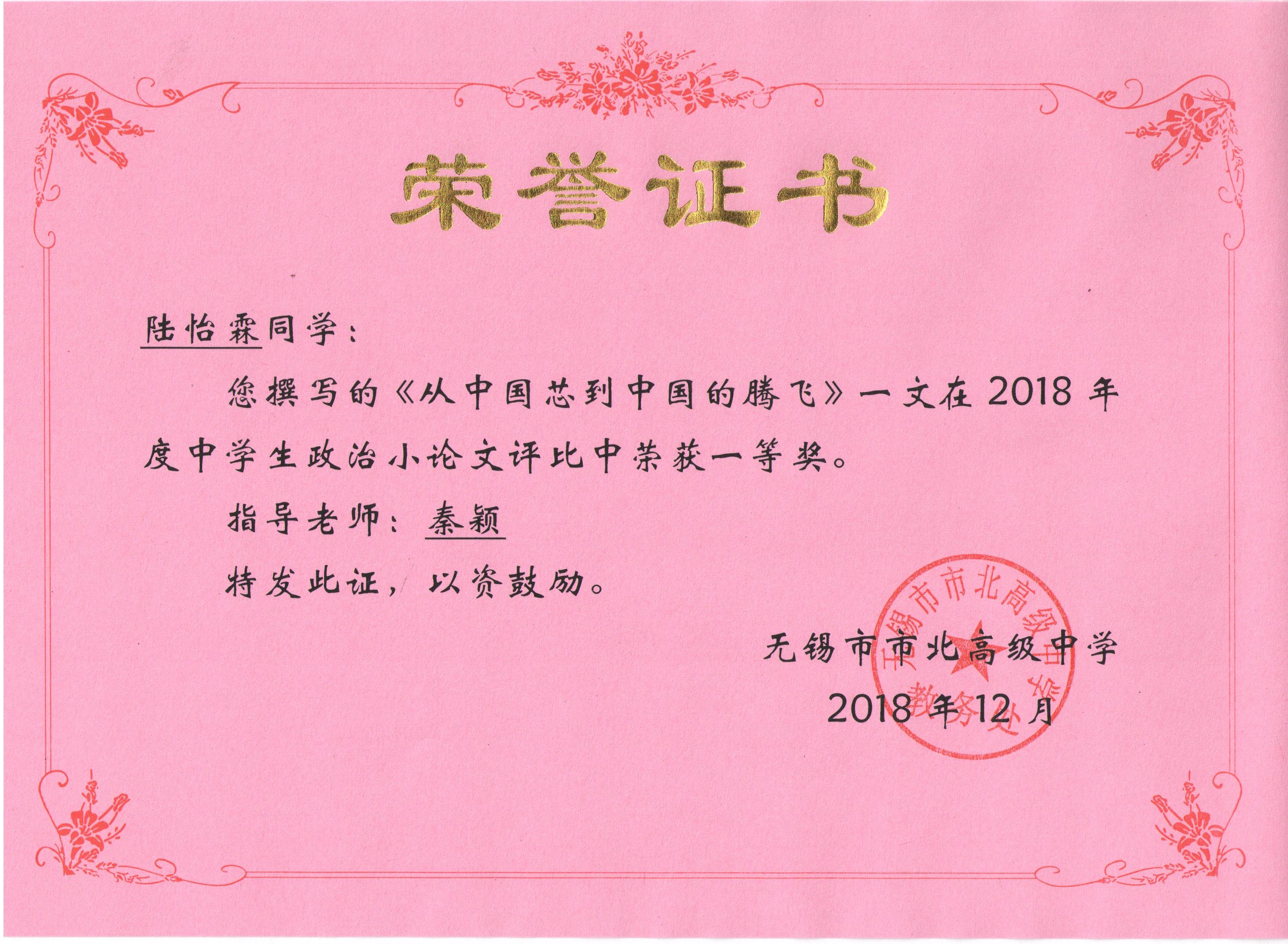 2018年无锡市中学生政治学科小论文校级获奖证书(一)