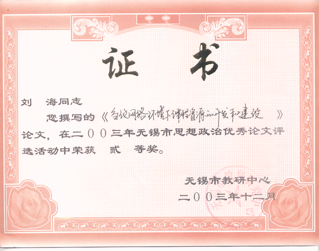2003年12月,论文《刍议网络环境下的课程资源的开发和建设》在无锡市教研中心举办的2003年度无锡市思想政治优秀论文评比中获得二等奖。